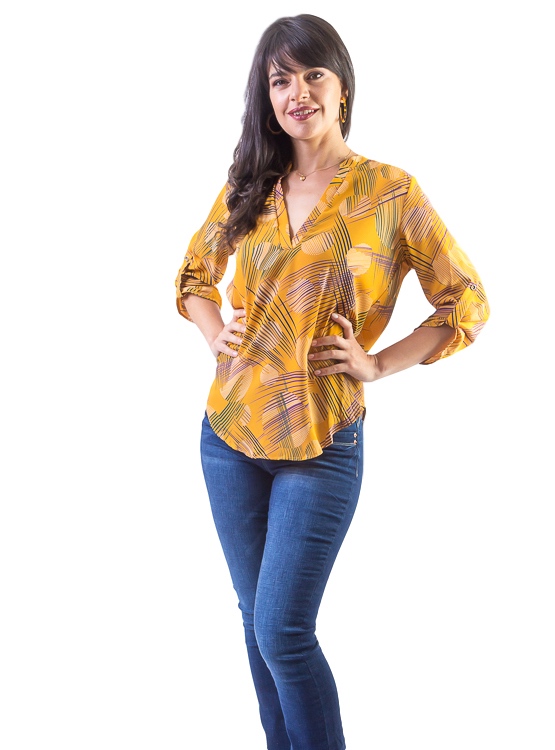 Disfruta de ésta cómoda blusa holgada color mostaza, con escote pronunciado, mangas 3/4 con sujetadores, pinza en la espalda y cuyo corte es más largo en la parte posterior, con respecto a la anterior.