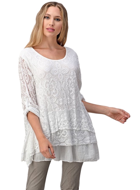 Blusa de encaje blanca, mangas con presillas, forrada con algodón. Primaveral, femenina, ideal para usarla con pantalones de tela, calzas o jeans, dependiendo de la ocasión.