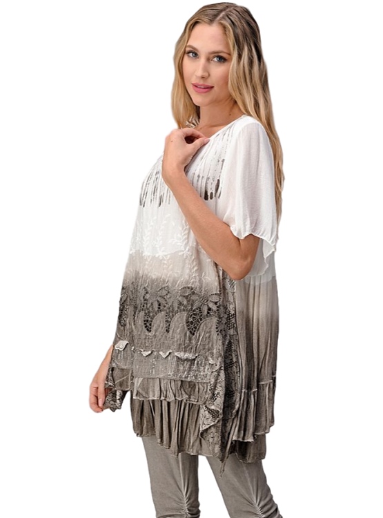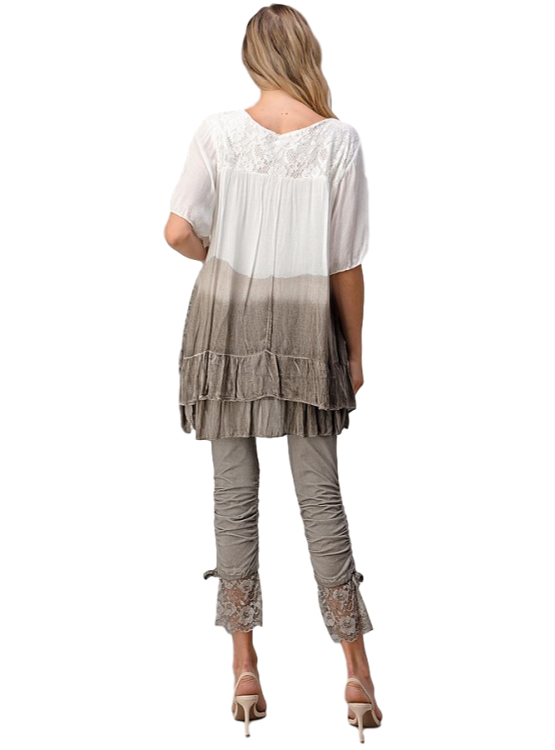 Blusón tipo túnica con encaje y lentejuelas en la parte inferior, que le dan un toque de brillo. Una elegante combinación del color crudo con taupé, manga corta, ideal para usarla con calzas en una tarde primaveral.