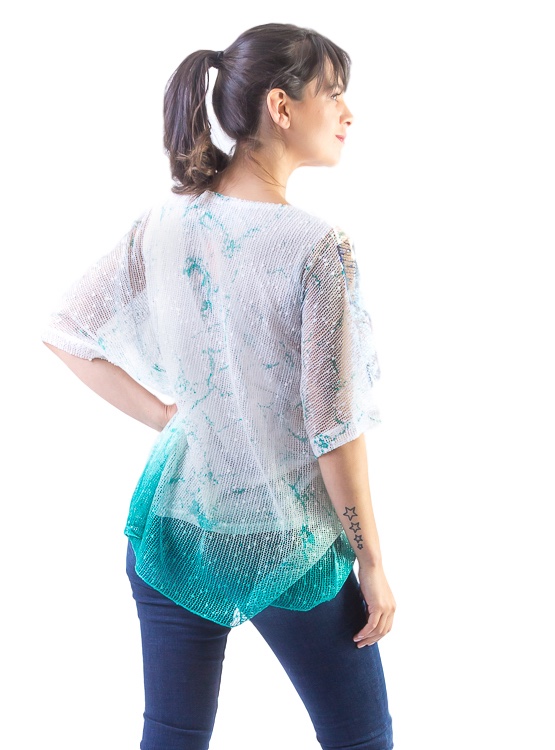 Blusa holgada, cuello redondo, tela tipo malla con aplicaciones de lentejuelas transparentes que le dan un brillo sutil. La puedes combinar con cualquier tipo de pantalón o jeans.
