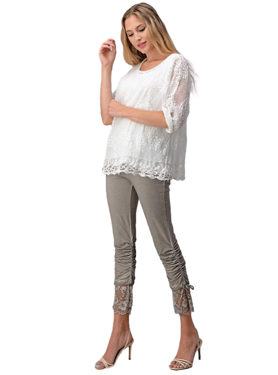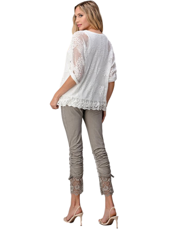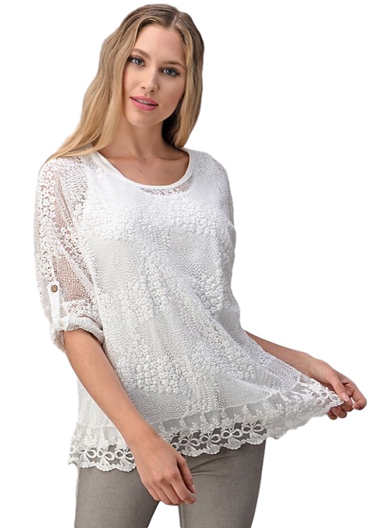 Blusa blanca de encaje, mangas con presillas, tiene una polera de algodón con viscosa que se ajusta al cuerpo. Sutil y elegante ideal para usarla con unos pantalones de tela o jeans dependiendo de la ocasión. En ésta primavera el blanco te acompaña.