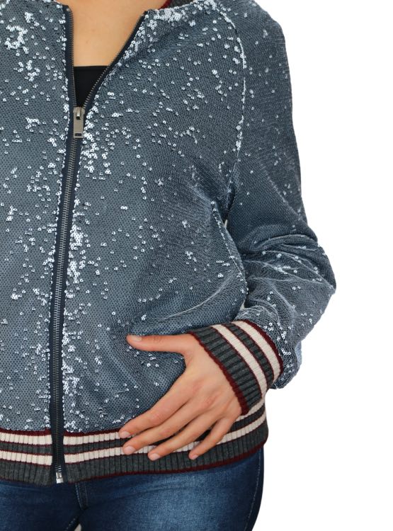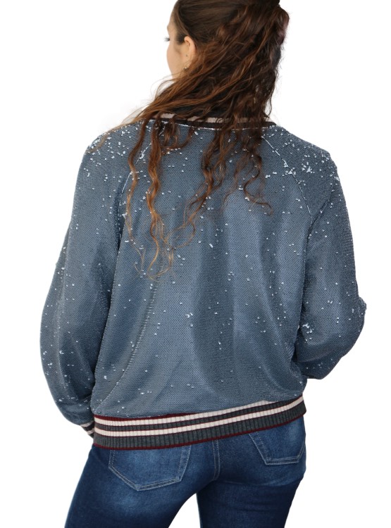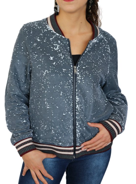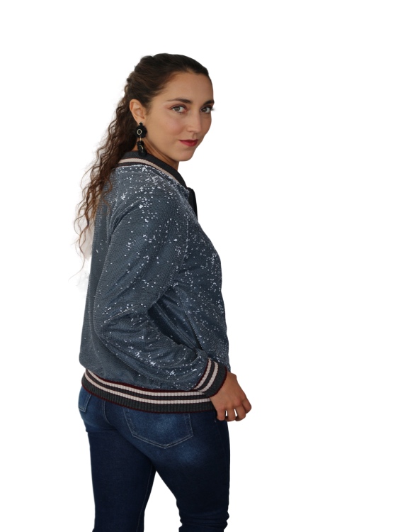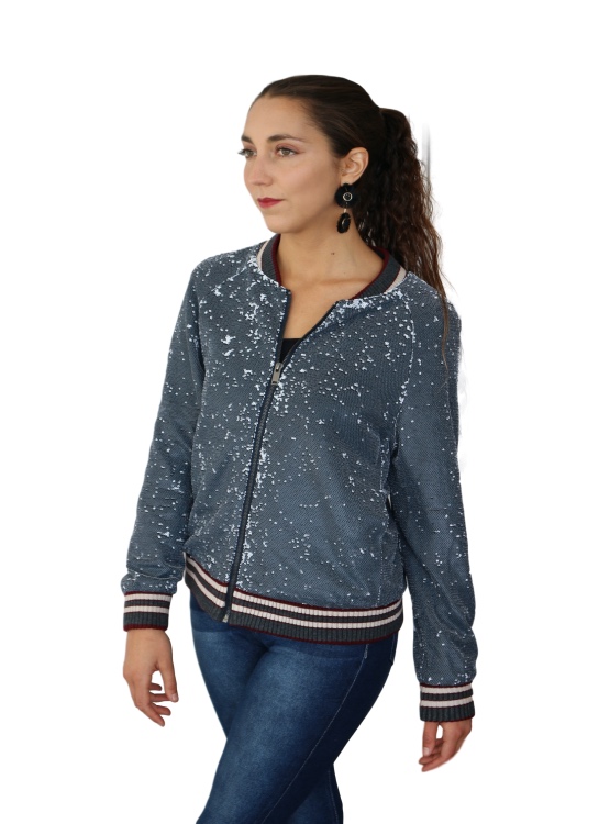 Chaqueta Bomber un clásico de la moda, con puños y pretina acanaladas, cierre frontal y bolsillos en los costados, tiene lentejuelas que le dan un brillo que resalta el diseño. Ideal para usarla con jeans o pantalón de tela, según la ocasión.