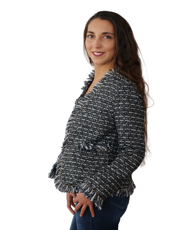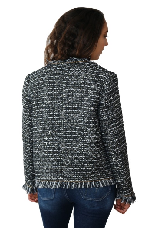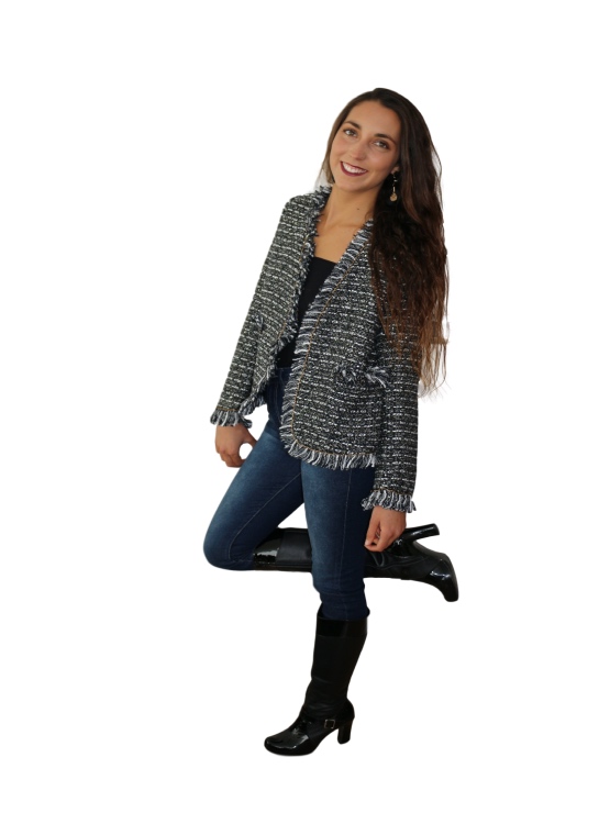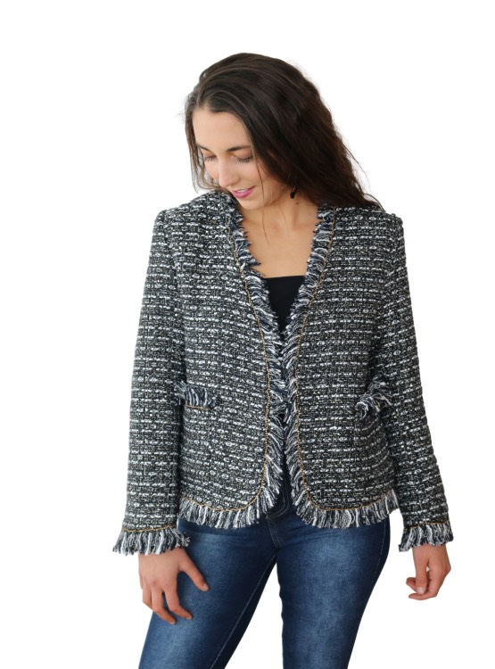 Chaqueta tela de tope color azúl matizada con mostacillas doradas, flecos en el borde, bolsillos y mangas, bolsillo integrado frontales. Tiene un estilo moderno que permite combinarla con unos jeans azules un pantalón clásico de color blanco o celeste.