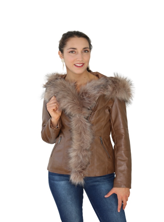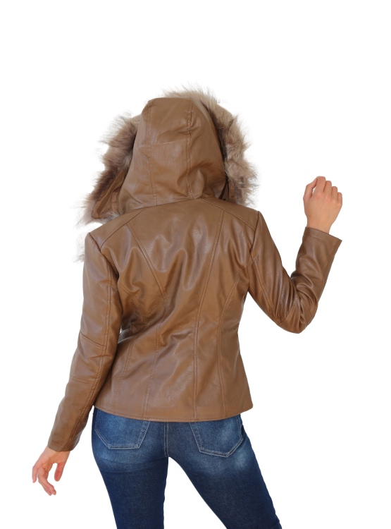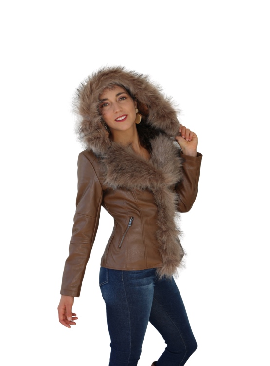 Chaqueta de cuero vegano, dúctil, con cierre central, bolsillos laterales y piel sintética en el centro, cuello y gorro. Tiene corte en la espalda lo que permite entallar la figura. Es práctica, juvenil y permite combinarla con cualquier tipo de jeans o pantalones.