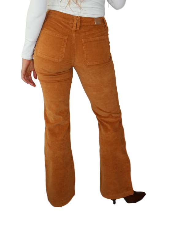 Nuestro pantalón acampanado de pana de tiro alto con bolsillos de parche. Con cuatro bolsillos funcionales, un amplio ajuste acampanado, cierre de un solo botón con cremallera frontal y trabillas para el cinturón.
