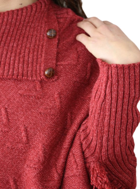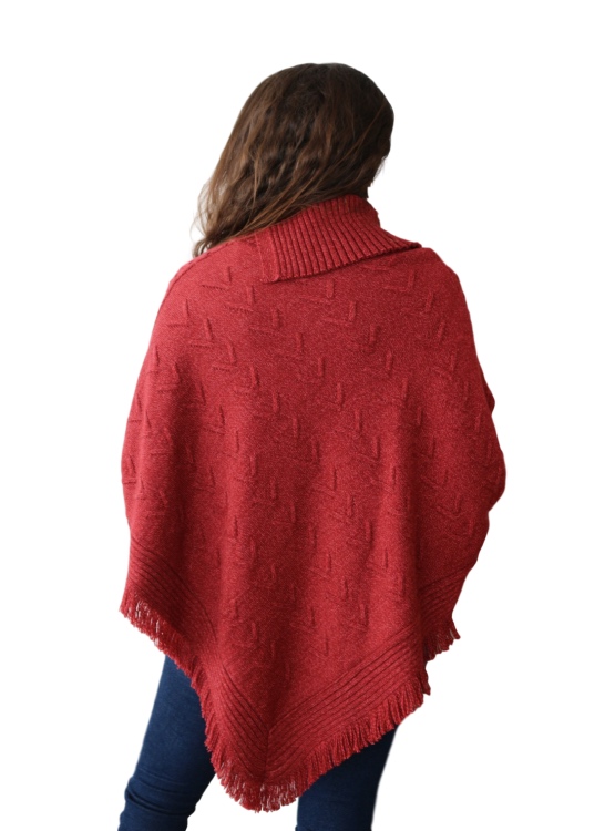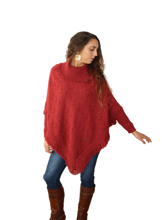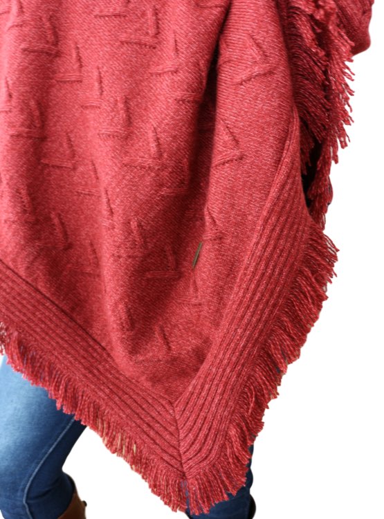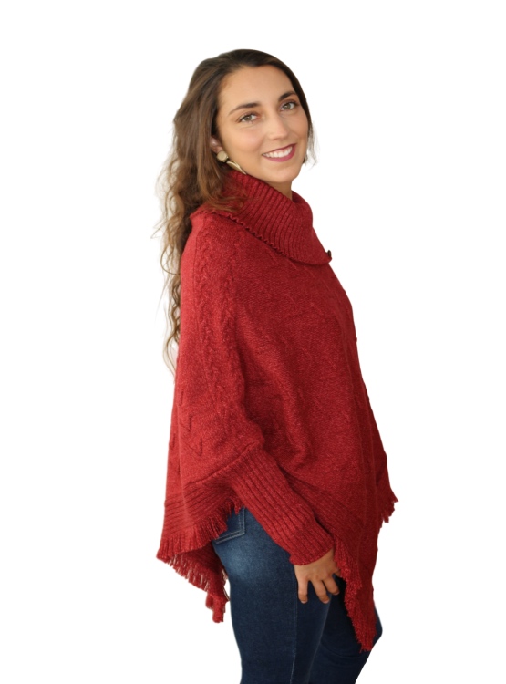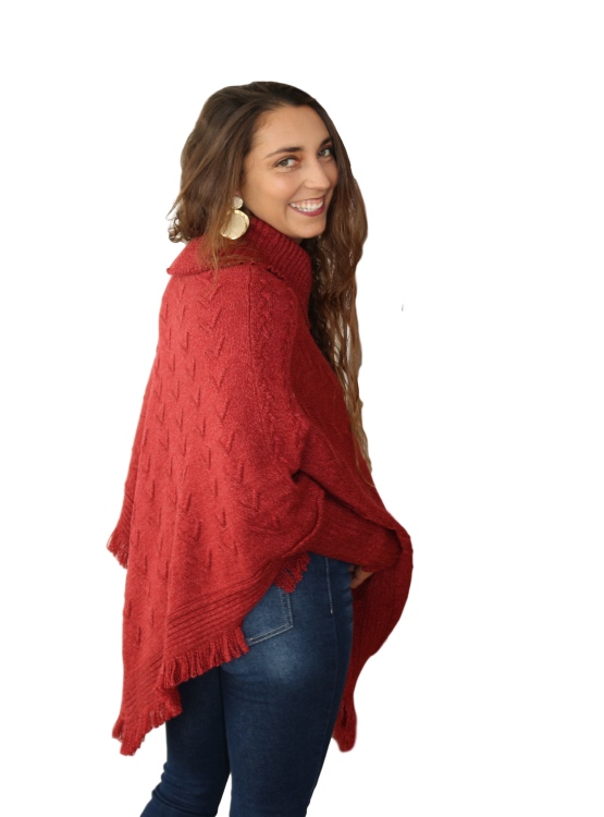 Poncho con mangas con puño acanaladas, con terminación en punta, flecos en el borde inferior, ideal para usarlo con jeans, palazzo o pitillos en un día de frío.