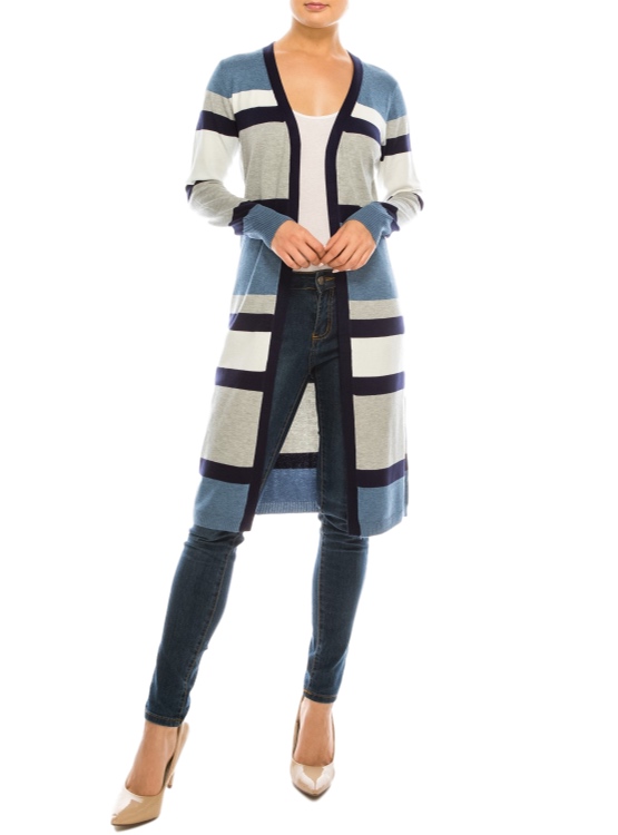 Tapado largo de primavera, con rayas y manga larga, de punto fino, casual y versátil ideal para combinarla con unos jeans.